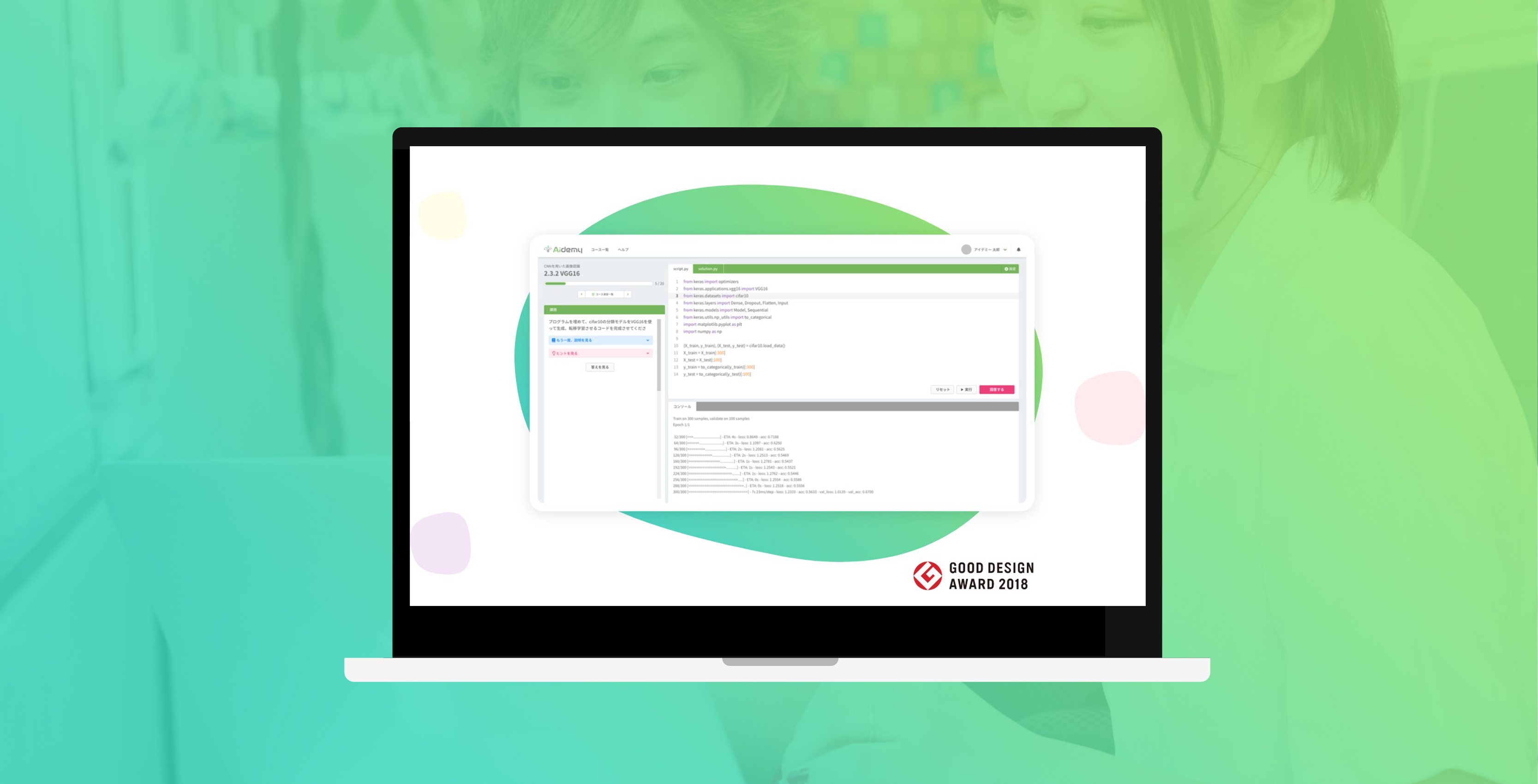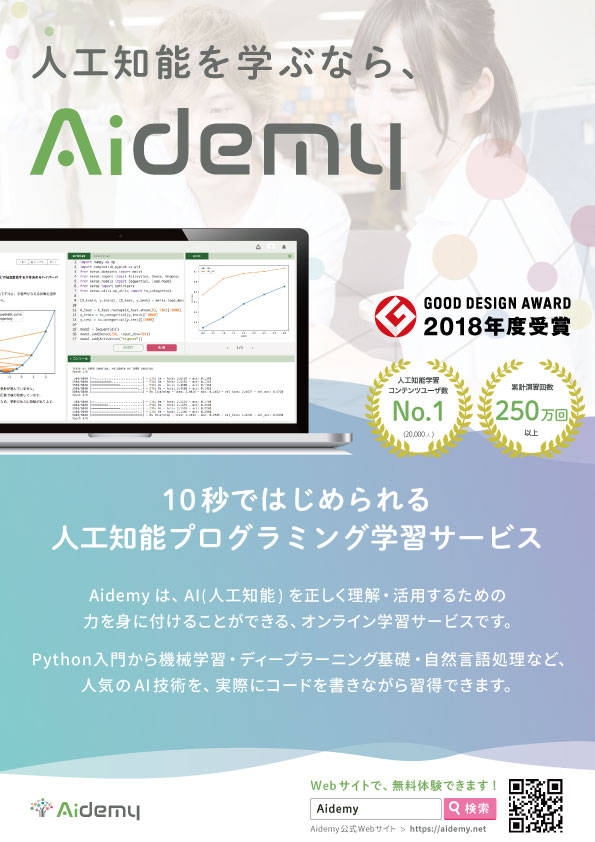 「はじめやすく・つづけやすい」 AIプログラミングのオンライン学習サービスです。面倒な環境構築や事前学習は不要で、コードを書きながら、AIを正しく理解し活用する力を身につけられます。登録ユーザ45,000人以上、総演習回数350万回以上を数え、日本最大級のAI学習サービスに成長。