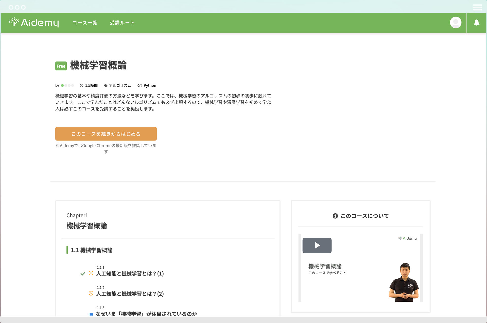 コース詳細画面では、ユーザが学習をはじめやすくなるように、ファーストビュー内に[続きから始める]導線を設置しました。また、学習を続けやすくなるように、ユーザ自身の進捗を把握しやすいようなリストデザインも工夫しました。