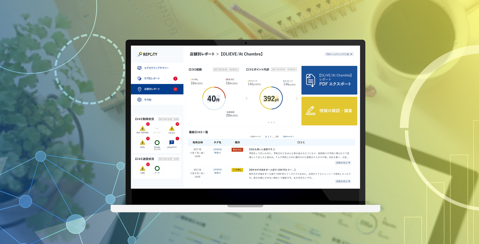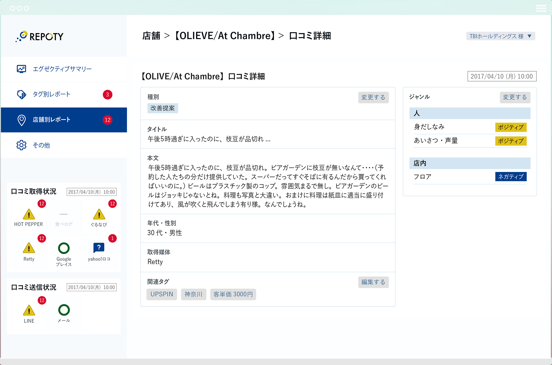 Repotyは、インターネットに分散するお店の口コミを自動収集し、口コミの傾向と店舗間の比較をレポートにて報告する飲食店向けマーケティングツールです。時間の掛かる口コミの収集業務の手間を自動化します。また、内容に応じて口コミのネガポジ判定や「人」「商品」「価格」などの分類を自動で行い、お客様の声を店舗経営改善に繋げます。