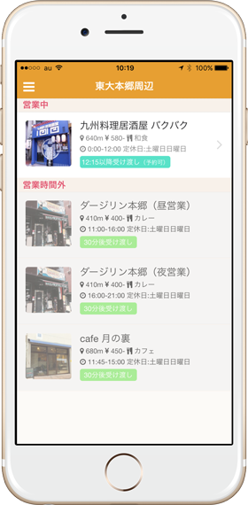 ランチタイムを快適にする、テイクアウト商品の事前予約サービスです。ユーザーは事前注文とキャッシュレス決済により待ち時間ゼロで商品を受け取れます。また、店舗側の管理アプリもあり、ユーザーからの予約を確認でき、事前に商品を調理してお客様にご提供できます。