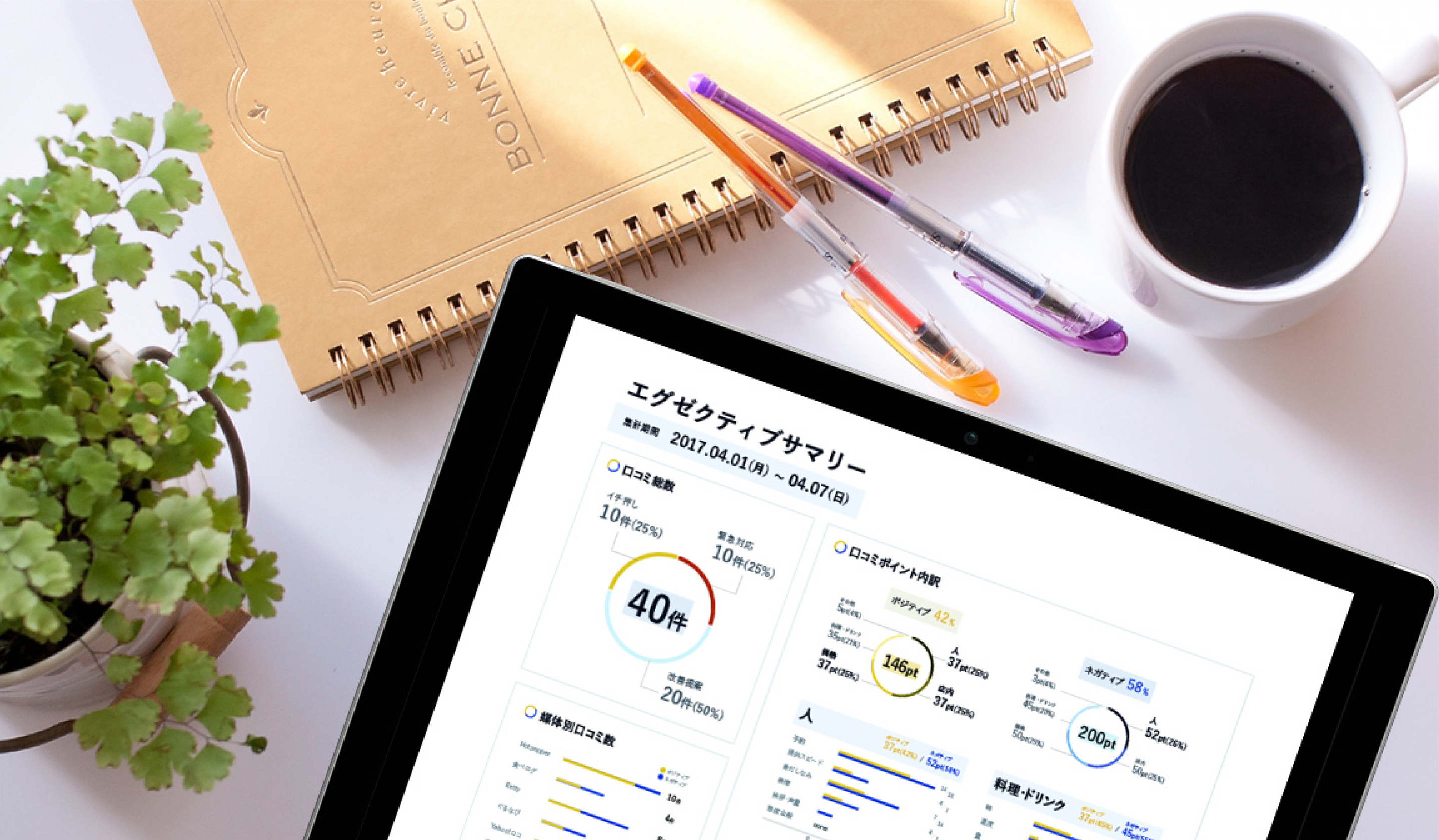 ・口コミデータという、ユーザーにとって胃の堅さを痛むような情報かつ店舗経営に関わるデータを伝えるサービスなので、信頼感あるベースに角丸を多用したり、適度にカラーやグラフを取り入れることで、ユーザーが使いやすく感じ、データに親しみを持てるようにした。