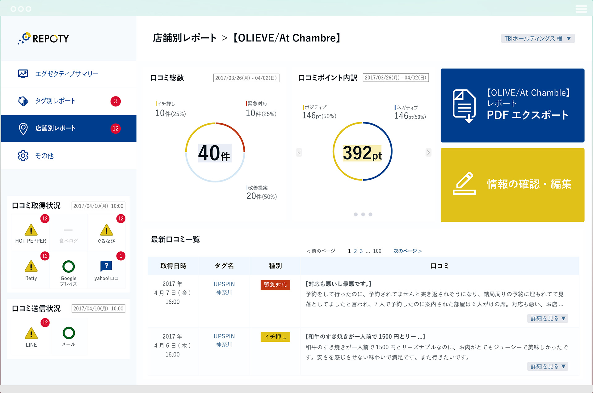 Repotyは、インターネットに分散するお店の口コミを自動収集し、口コミの傾向と店舗間の比較をレポートにて報告する飲食店向けマーケティングツールです。時間の掛かる口コミの収集業務の手間を自動化します。また、内容に応じて口コミのネガポジ判定や「人」「商品」「価格」などの分類を自動で行い、お客様の声を店舗経営改善に繋げます。